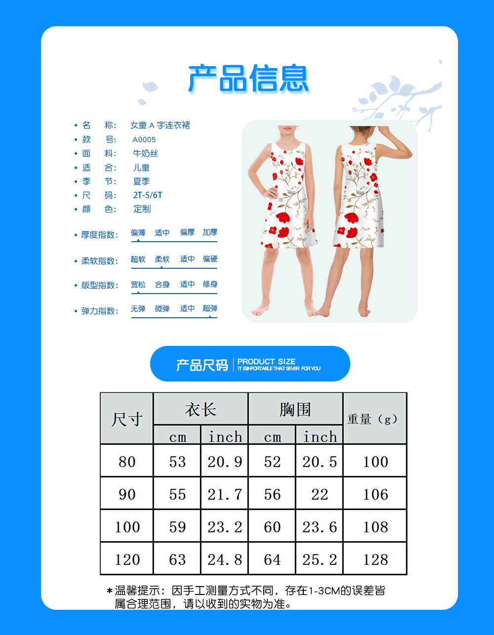 中文名称: 3D 儿童A字连衣裙 英文名称: Children's A-line dress产品编号:A0005生产工艺: 满印印花产品材质:牛奶丝
