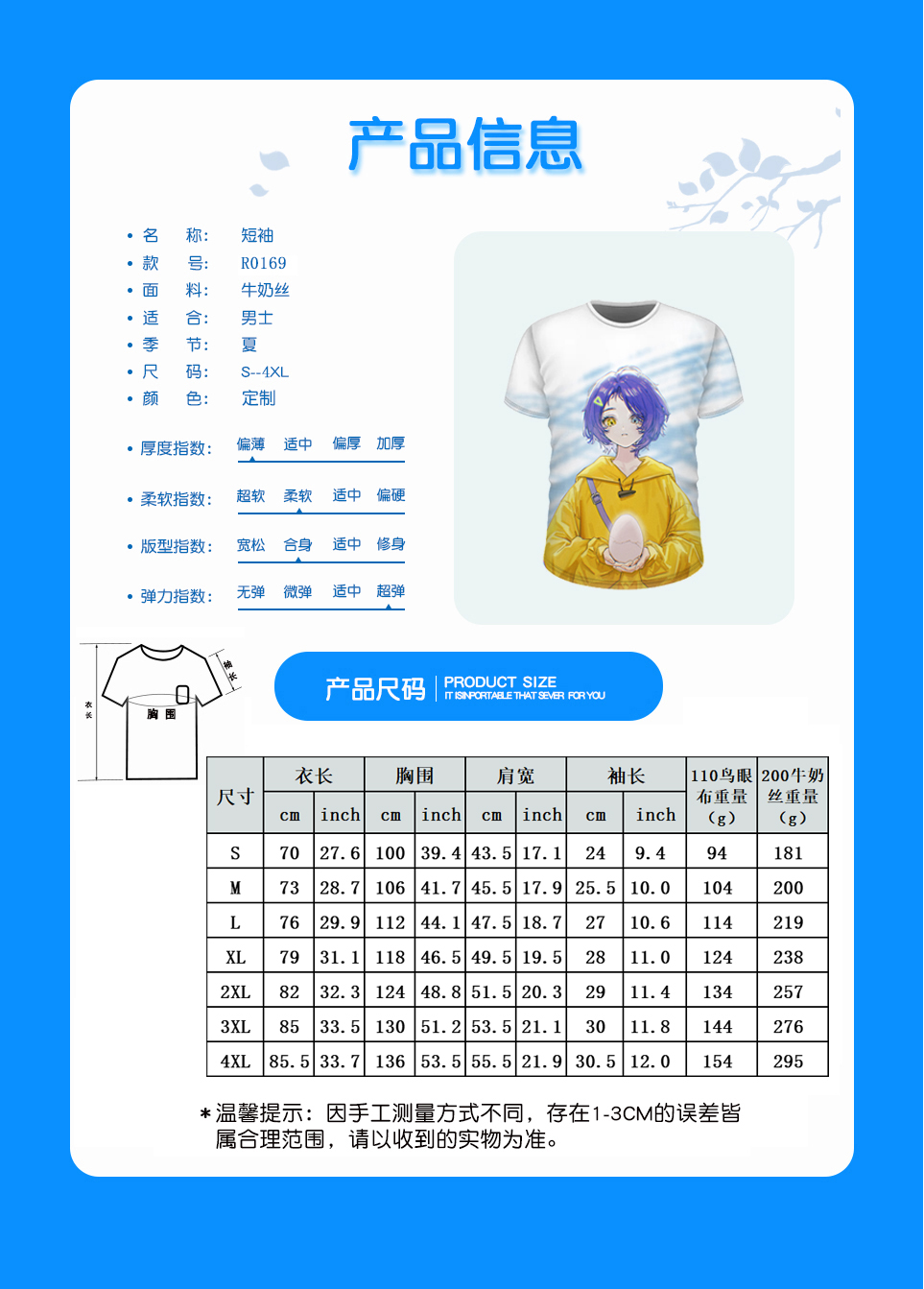 中文名称:短袖英文名称:产品货号:R0169生产工艺: 满印印花产品材质: 涤纶(Polyester)