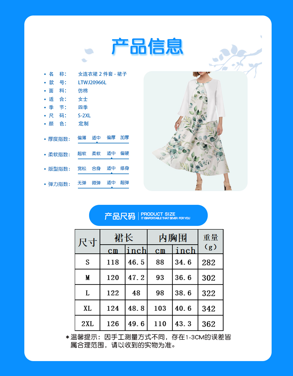 中文名称:连衣裙英文名称:产品货号:LTWJ20966L生产工艺: 满印印花产品材质:仿棉