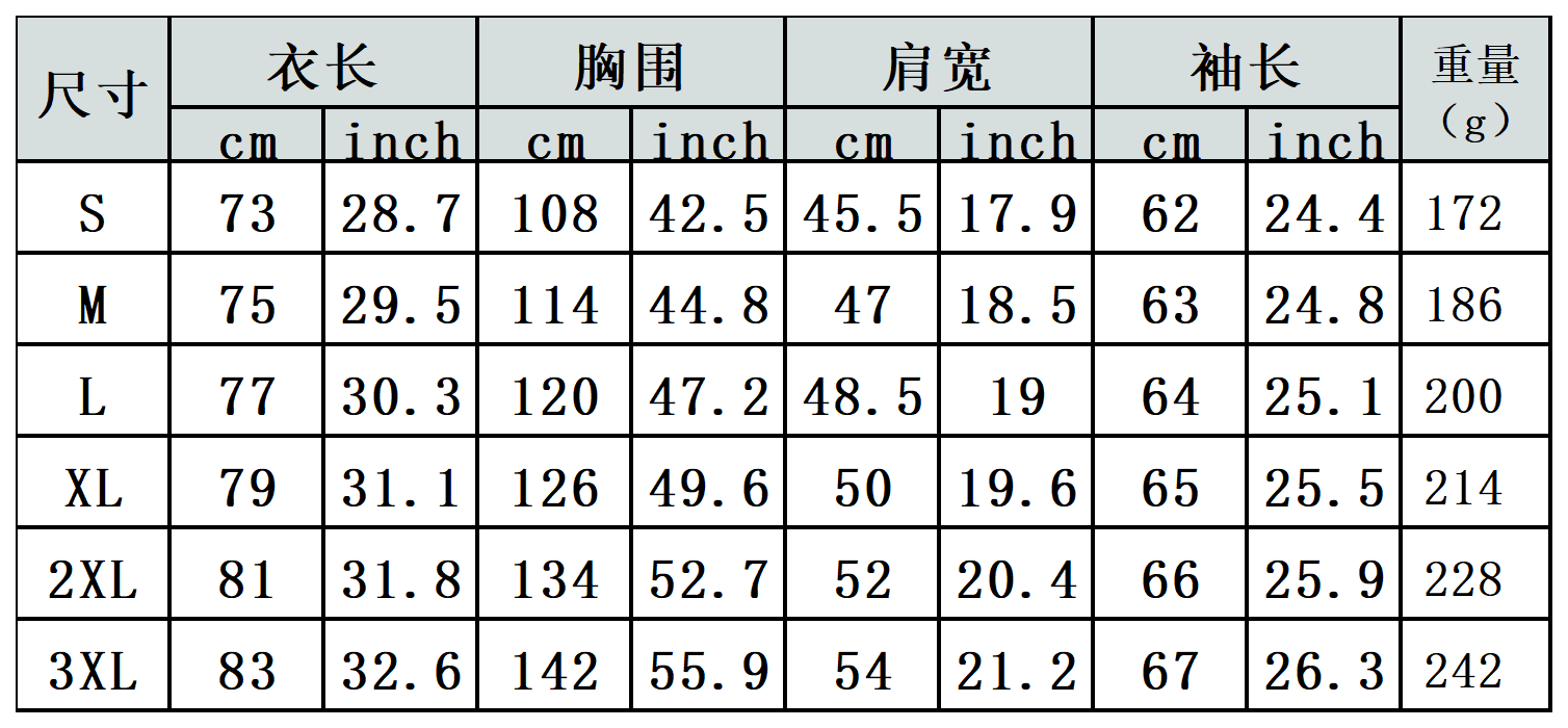 【特别说明】此尺码数据在衣服平铺下测量所得,因测量方法不同,误差在1-3cm内的属于正常现象