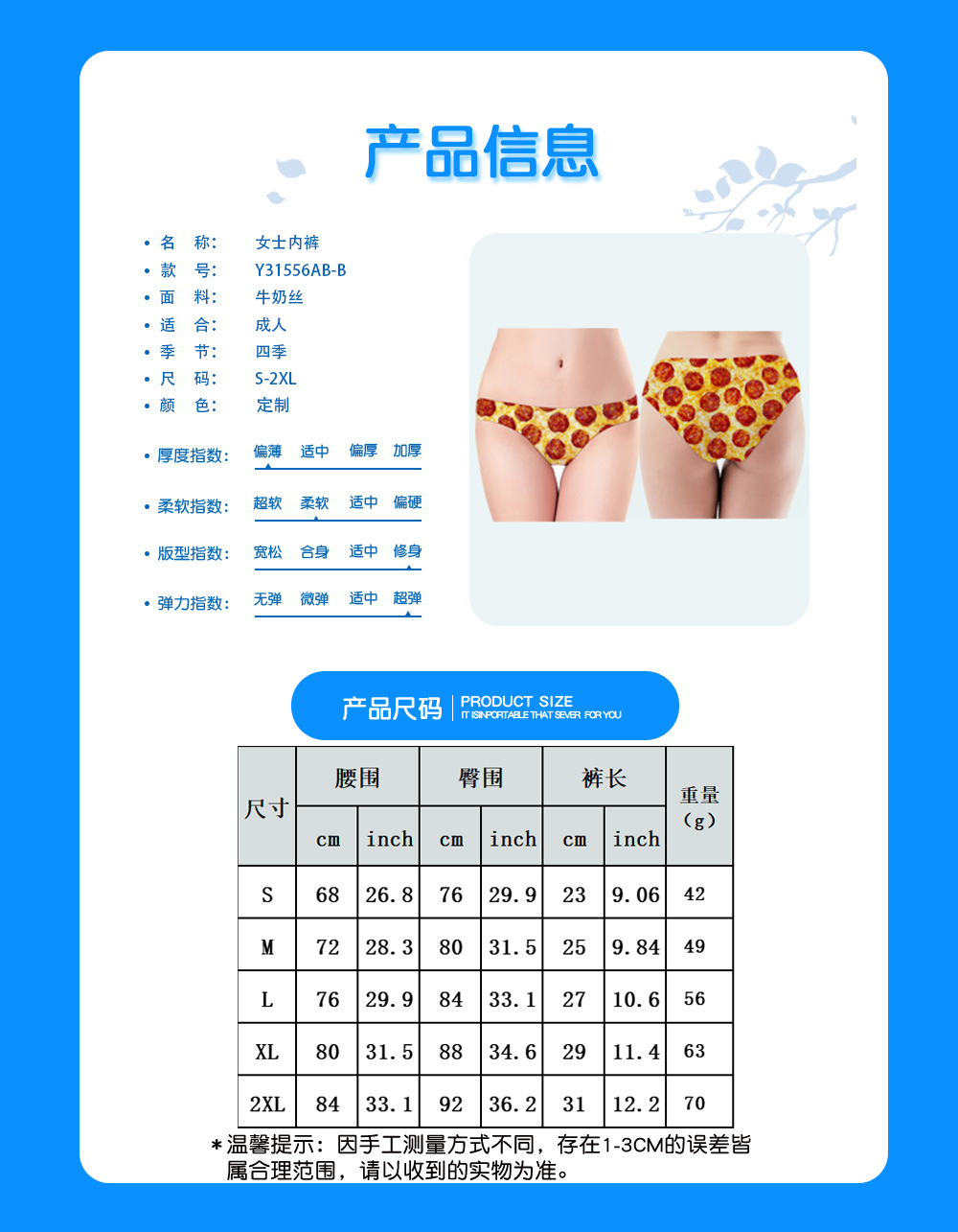 中文名称: 女士内裤英文名称: 产品编号:Y31556AB-B生产工艺: 满印印花产品材质: 牛奶丝