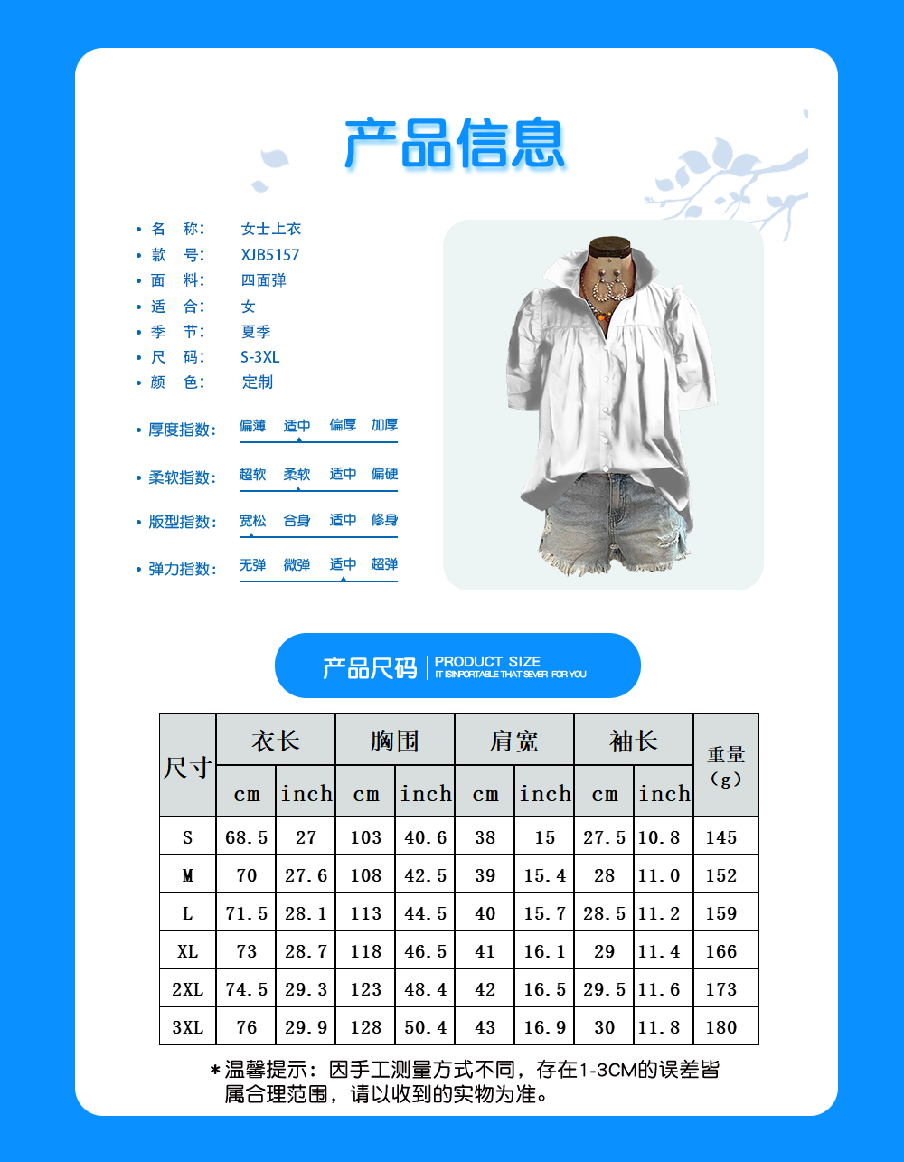 中文名称:女士上衣英文名称:产品货号:XJB5157生产工艺: 满印印花产品材质:四面弹