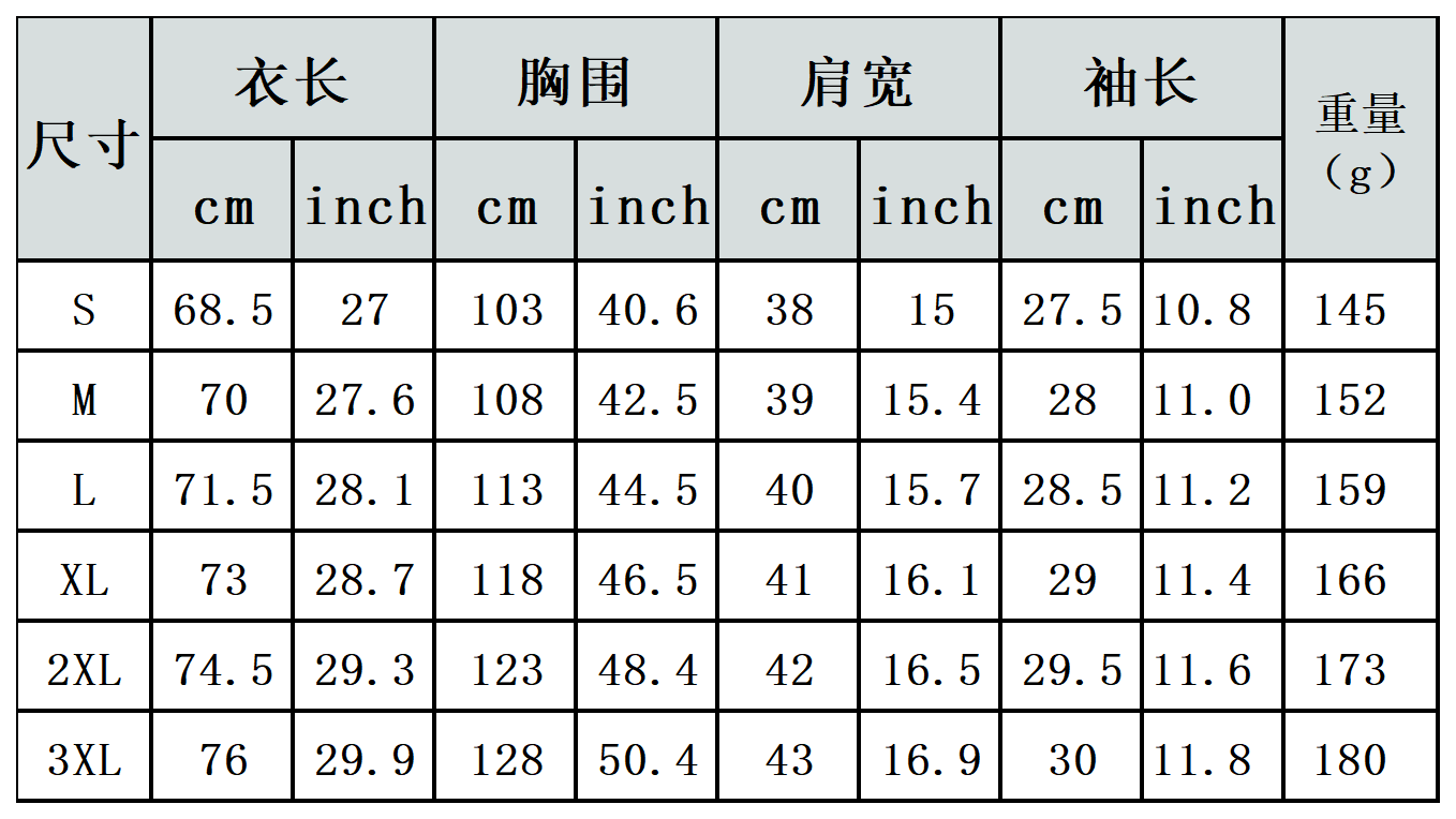 【特别说明】此尺码数据在衣服平铺下测量所得,因测量方法不同,误差在1-3cm内的属于正常现象