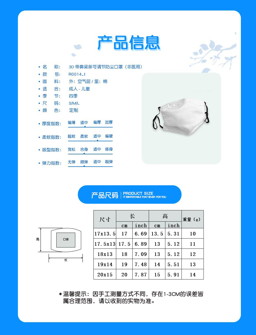 【产品性能】非常柔软,透气,耐洗,带扣子可调整松紧度,可以根据自己的面部轮廓随意更改其长度,以防脱下后在脸上留下痕迹。可保护你的嘴和脸防止灰尘、寒冷、灰尘、花粉、过敏、雾和霾、尾气排放、被动吸烟等等