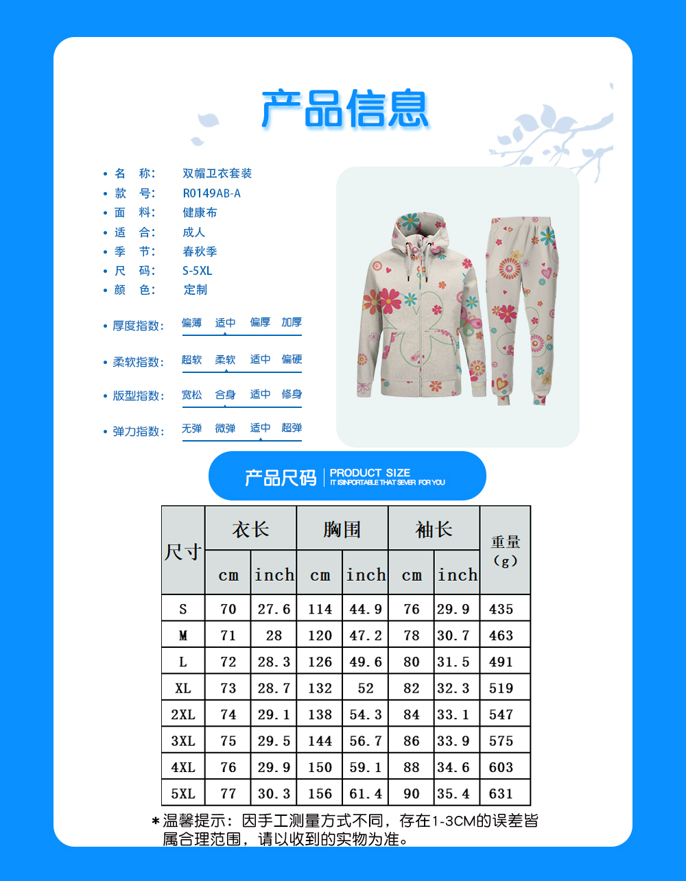 中文名称:双帽套装-上衣英文名称:产品货号:R0149AB-A生产工艺: 满印印花产品材质: 健康布