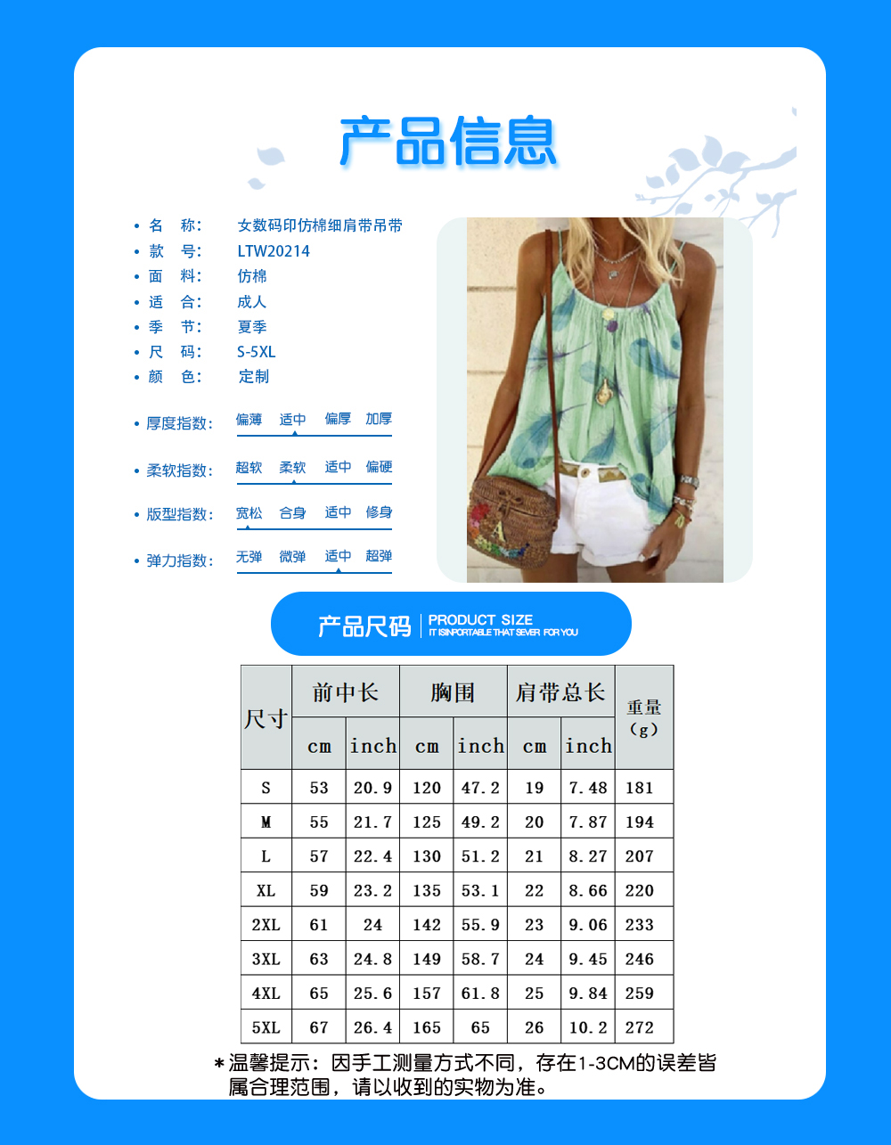 中文名称:细肩带吊带T恤英文名称:产品货号:LTW20214生产工艺: 满印印花产品材质: 仿棉