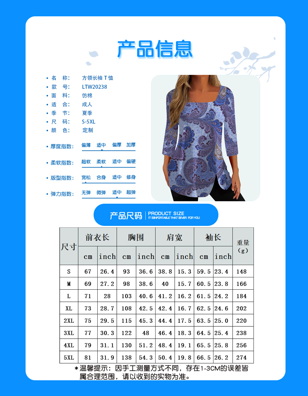 中文名称:方领长袖T恤英文名称:产品货号:LTW20238生产工艺: 满印印花产品材质: 仿棉