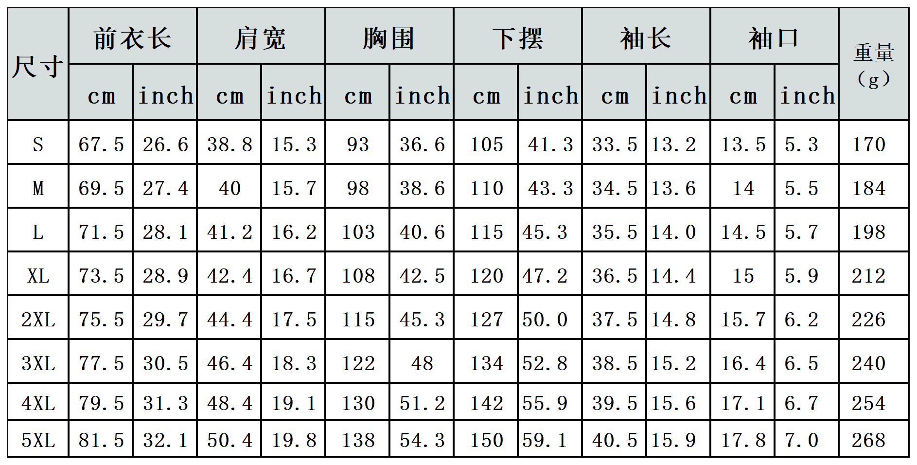 【特别说明】此尺码数据在衣服平铺下测量所得,因测量方法不同,误差在1-3cm内的属于正常现象