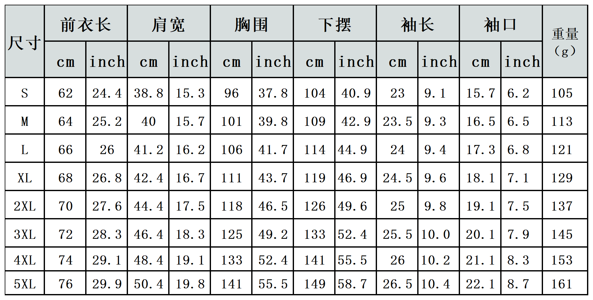 【特别说明】此尺码数据在衣服平铺下测量所得,因测量方法不同,误差在1-3cm内的属于正常现象