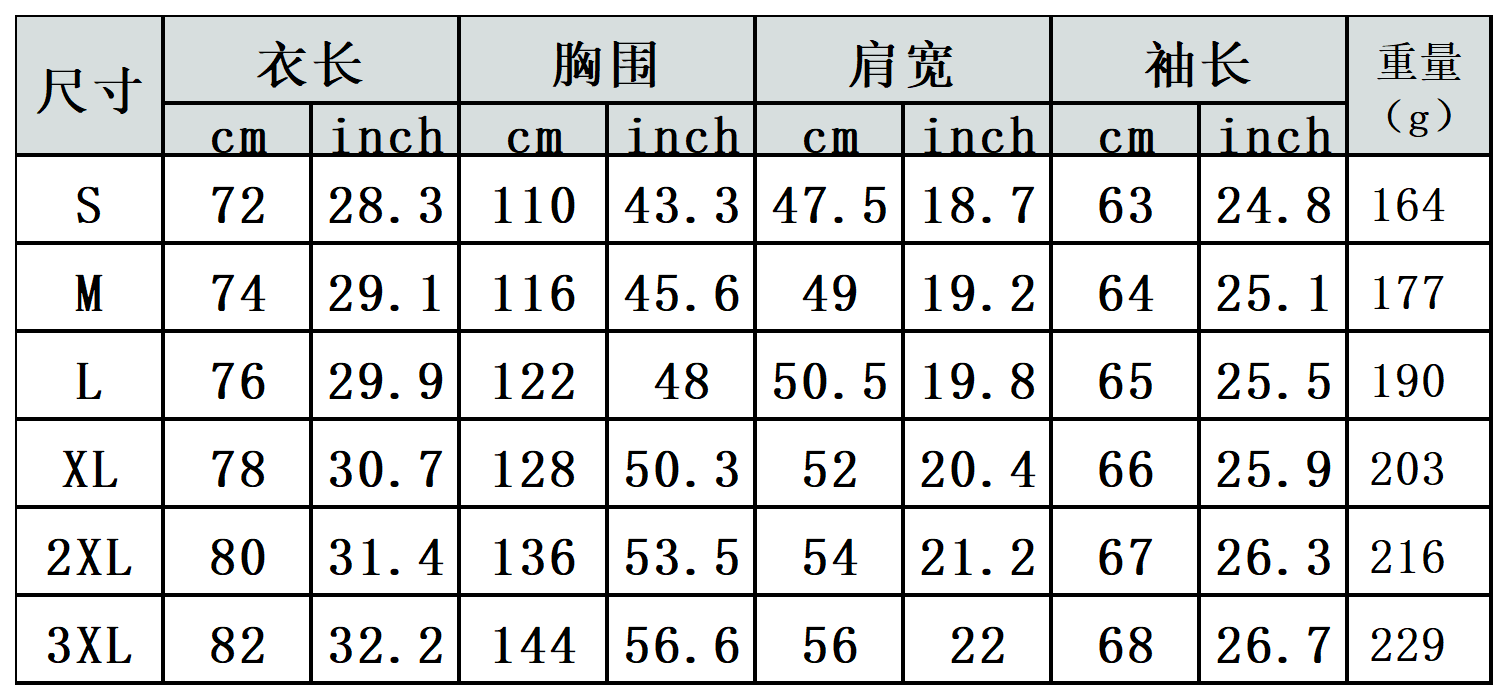 【特别说明】此尺码数据在衣服平铺下测量所得,因测量方法不同,误差在1-3cm内的属于正常现象