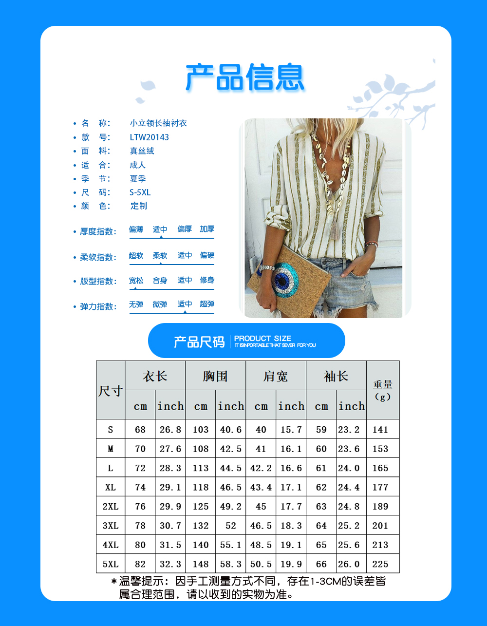 中文名称:女数码花瑶小立领长袖衬衣英文名称:产品货号:LTW20143生产工艺: 满印印花产品材质:真丝绒