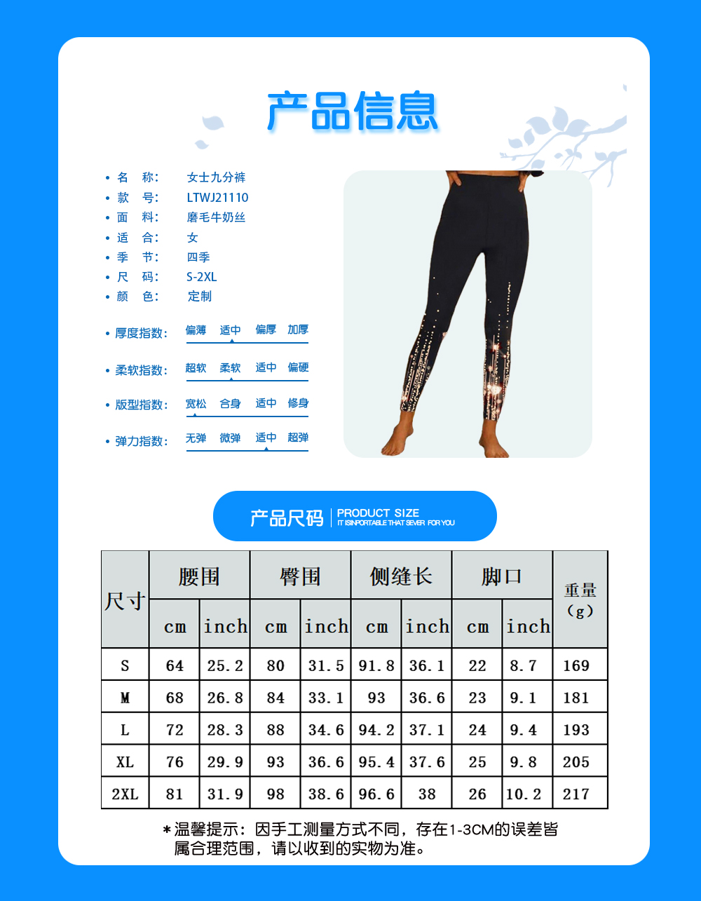 中文名称:女士九分裤英文名称:产品货号:LTWJ21110生产工艺: 满印印花产品材质: 磨毛牛奶丝