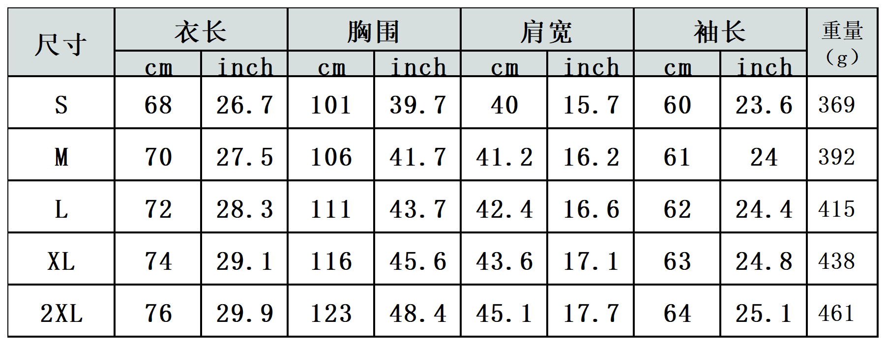 【特别说明】此尺码数据在衣服平铺下测量所得,因测量方法不同,误差在1-3cm内的属于正常现象