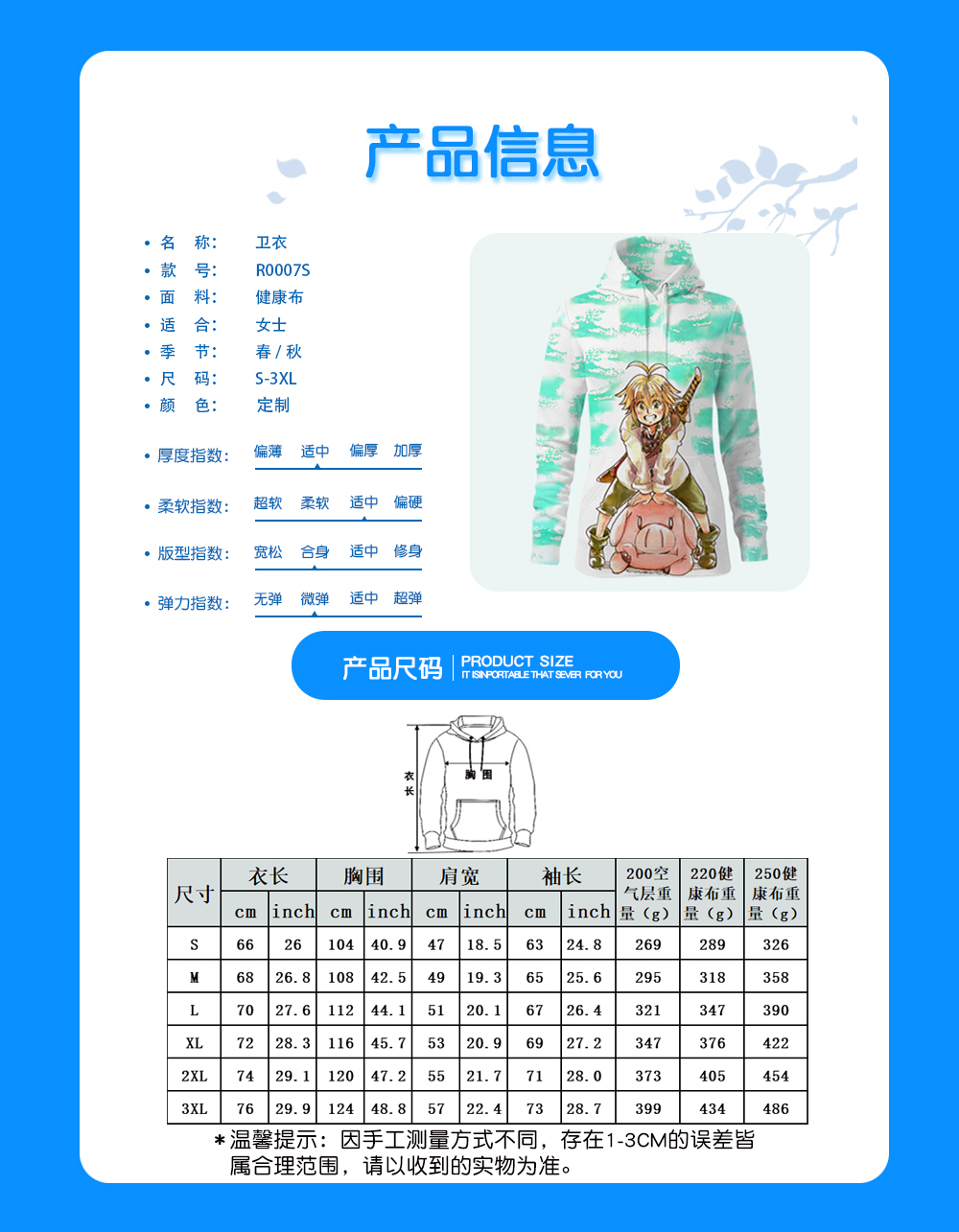 中文名称:女款卫衣英文名称:产品货号:R0007S生产工艺: 满印印花产品材质: 空气层