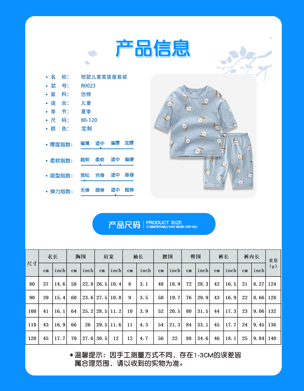 中文名称:E-DKJJTZ 短款儿童家居服套装英文名称:产品货号:R0023生产工艺: 满印印花产品材质: 仿棉