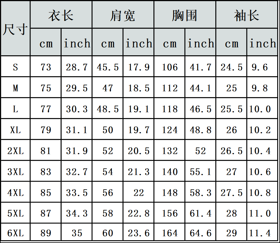【特别说明】此尺码数据在衣服平铺下测量所得,因测量方法不同,误差在1-3cm内的属于正常现象