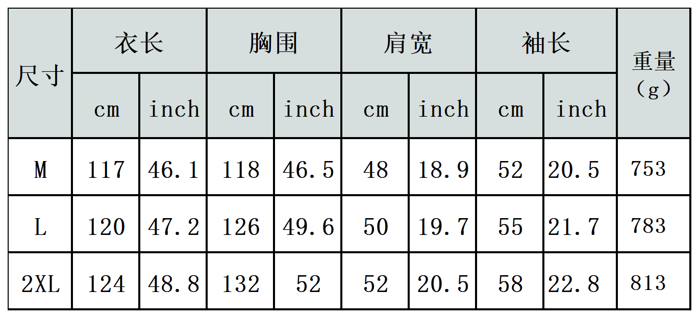 【特别说明】此尺码数据在衣服平铺下测量所得,因测量方法不同,误差在1-3cm内的属于正常现象