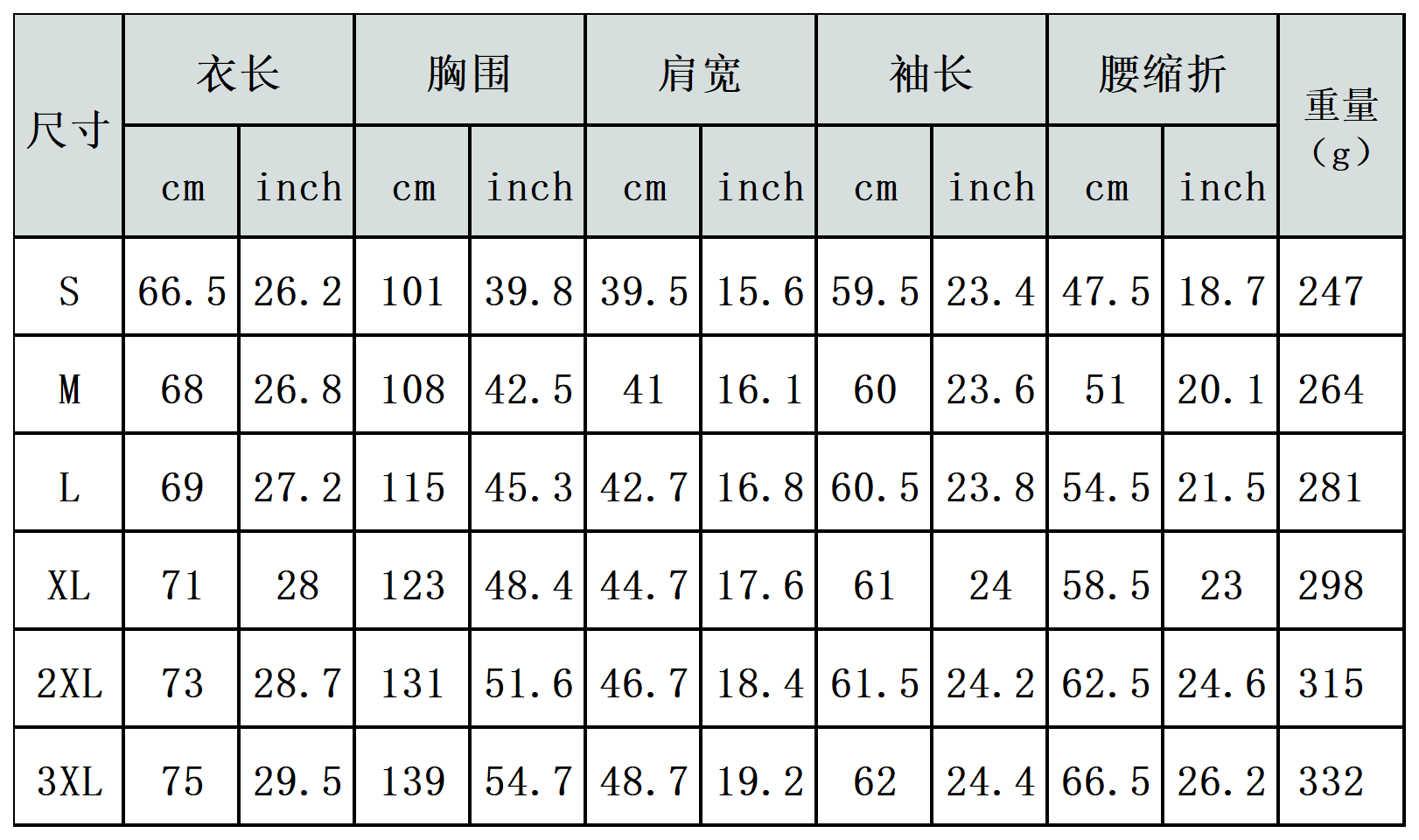 【特别说明】此尺码数据在衣服平铺下测量所得,因测量方法不同,误差在1-3cm内的属于正常现象