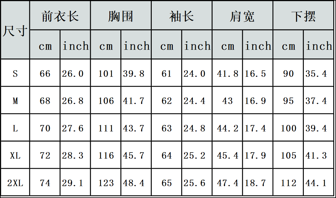 【特别说明】此尺码数据在衣服平铺下测量所得,因测量方法不同,误差在1-3cm内的属于正常现象