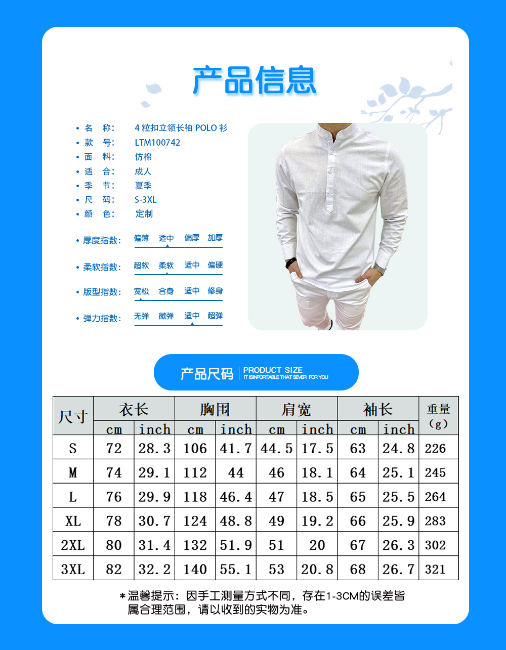 【特别说明】此尺码数据在衣服平铺下测量所得,因测量方法不同,误差在1-3cm内的属于正常现象