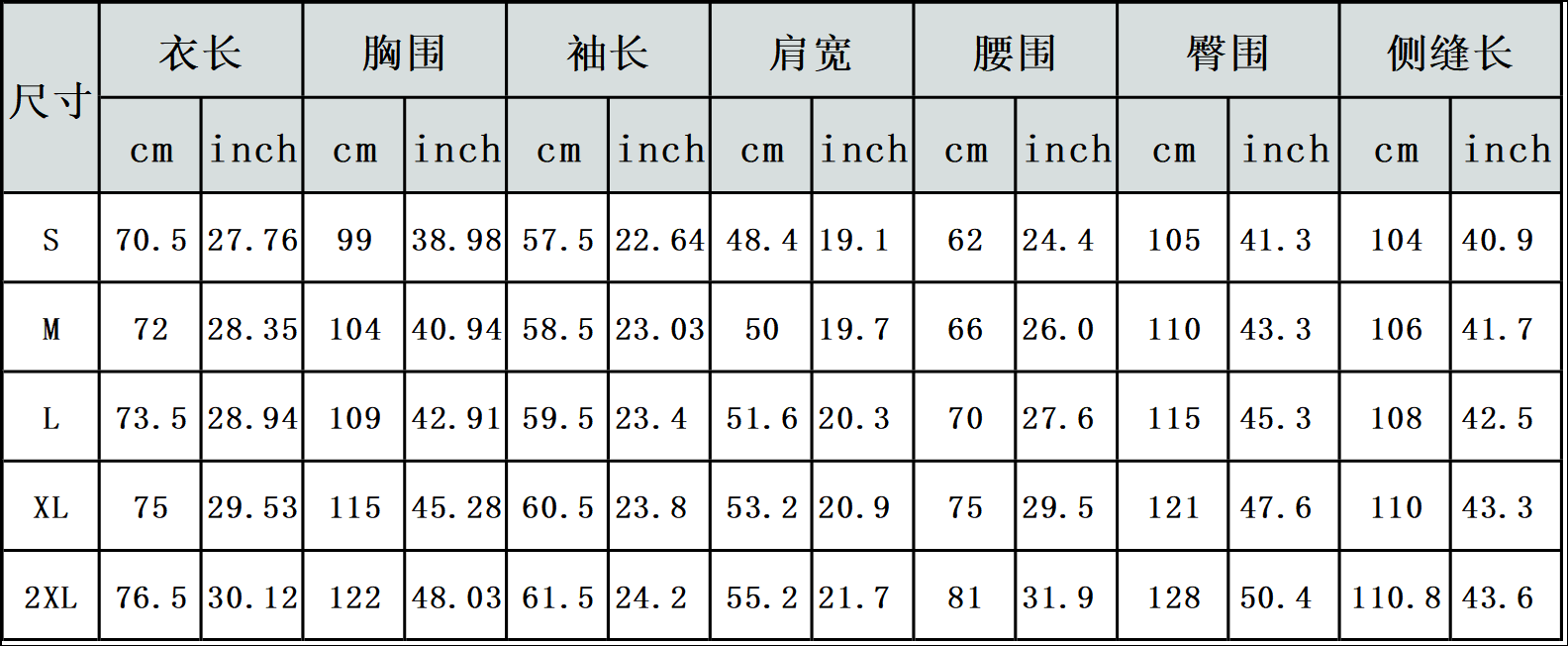 【特别说明】此尺码数据在衣服平铺下测量所得,因测量方法不同,误差在1-3cm内的属于正常现象