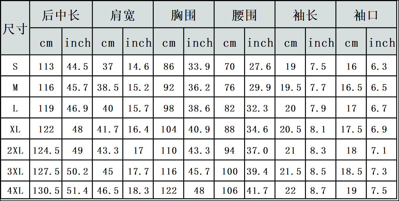 【特别说明】此尺码数据在衣服平铺下测量所得,因测量方法不同,误差在1-3cm内的属于正常现象