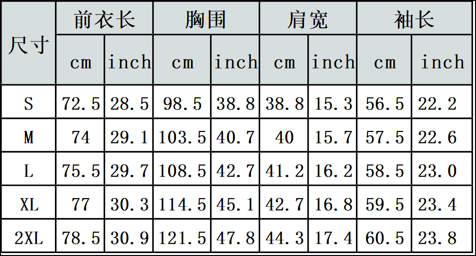 【特别说明】此尺码数据在衣服平铺下测量所得,因测量方法不同,误差在1-3cm内的属于正常现象