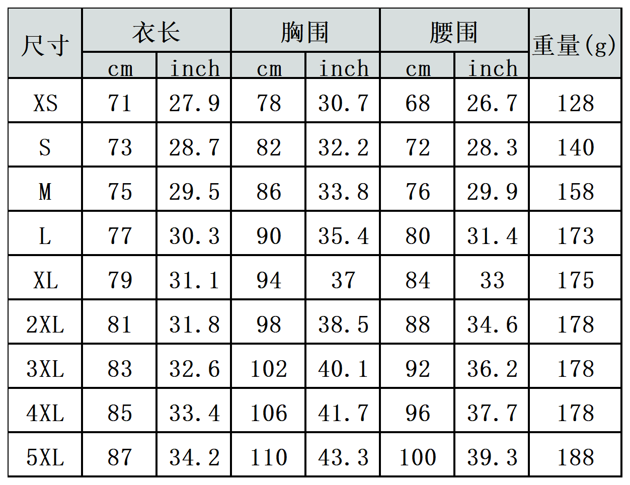 【特别说明】此尺码数据在衣服平铺下测量所得,因测量方法不同,误差在1-3cm内的属于正常现象