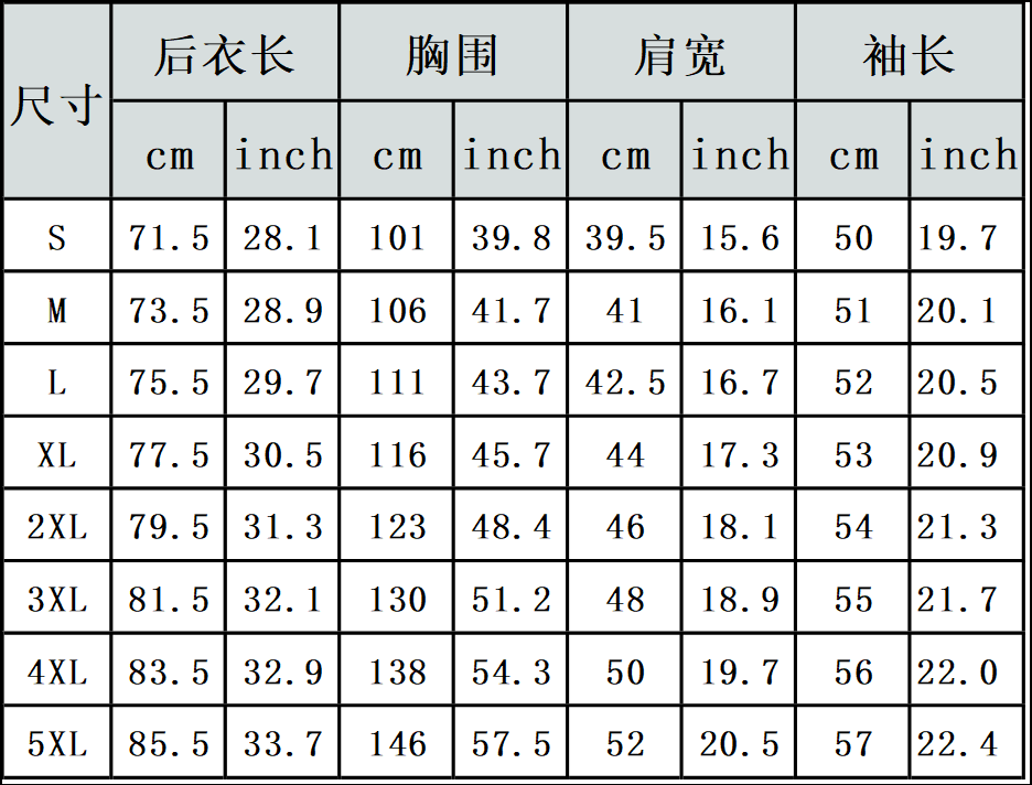 【特别说明】此尺码数据在衣服平铺下测量所得,因测量方法不同,误差在1-3cm内的属于正常现象