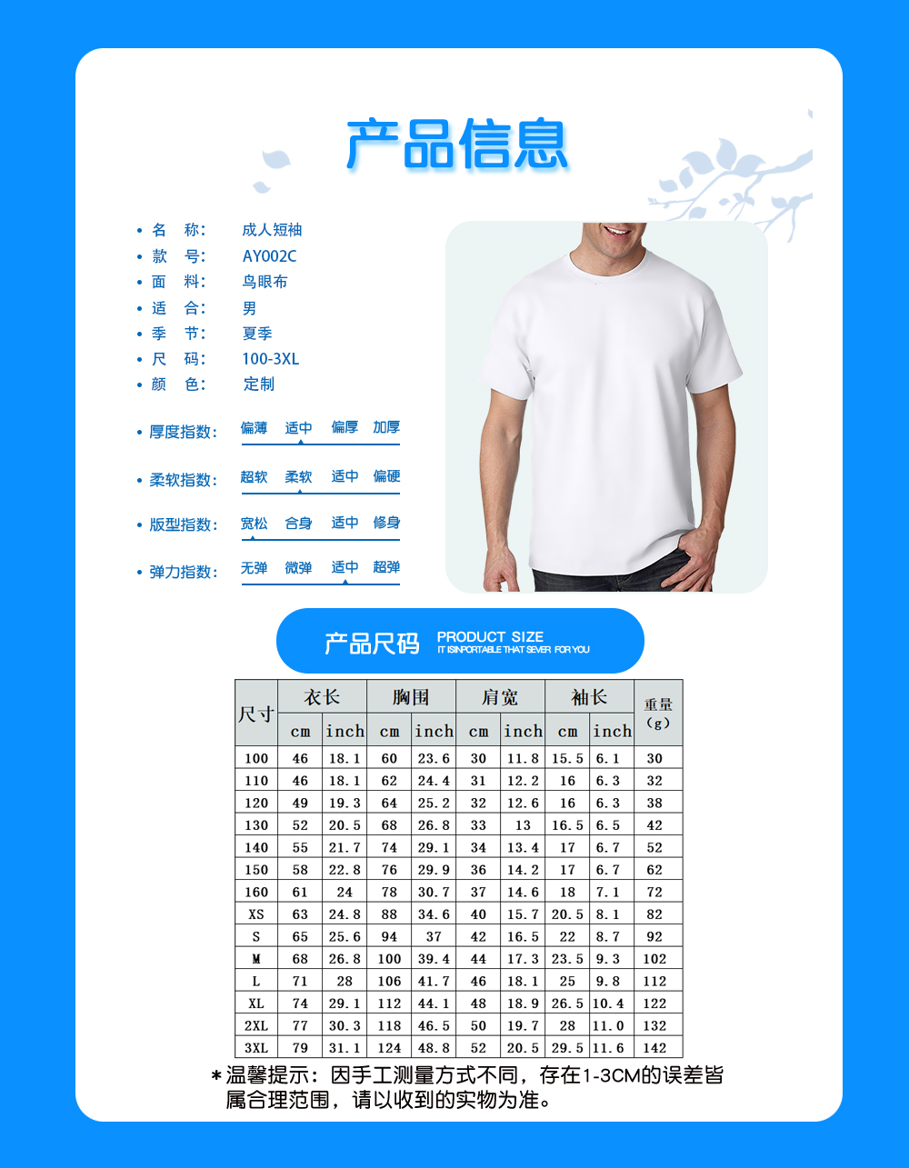 中文名称:成人短袖英文名称:产品货号:AY002C生产工艺: 满印印花产品材质:鸟眼布