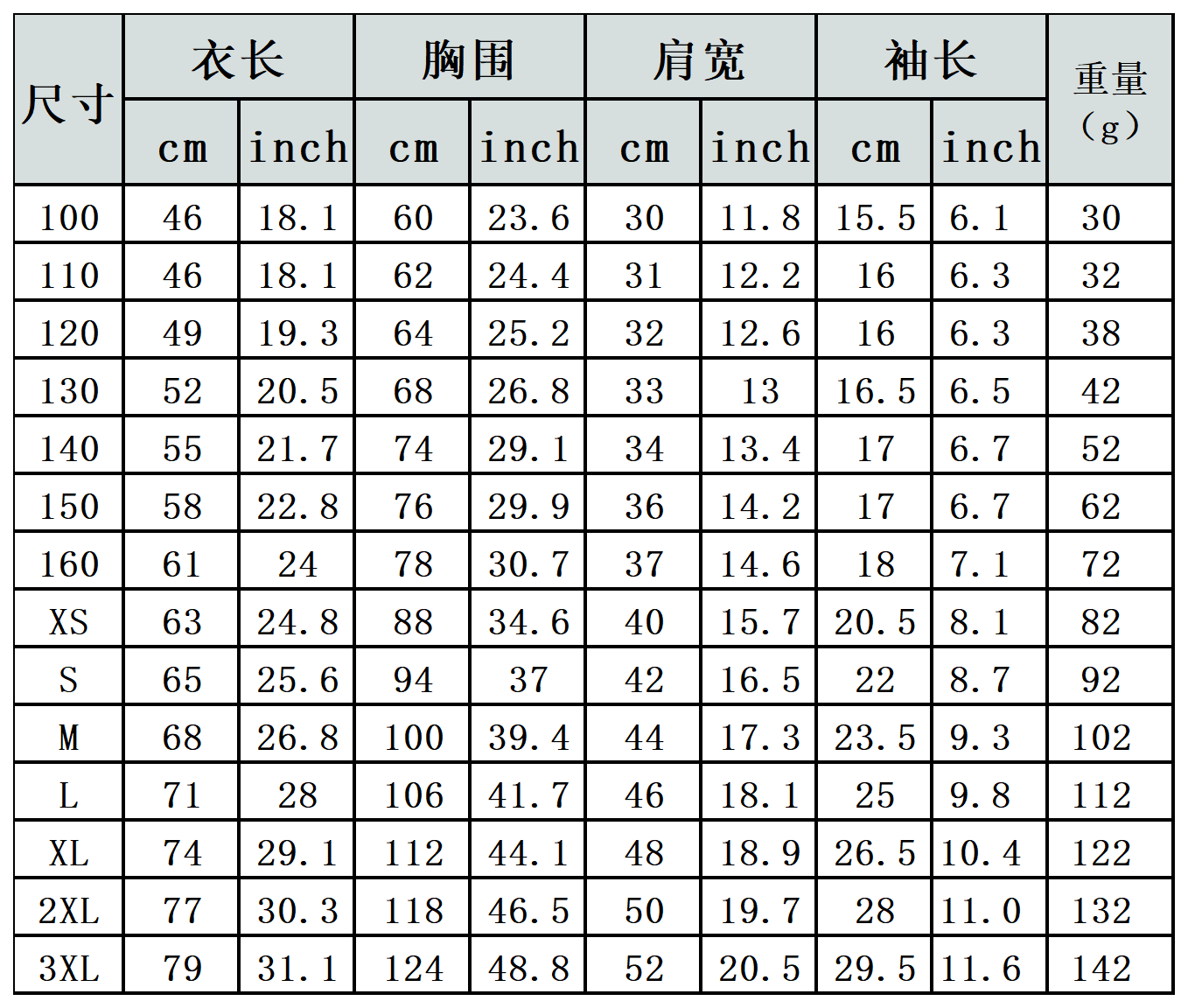 【特别说明】此尺码数据在衣服平铺下测量所得,因测量方法不同,误差在1-3cm内的属于正常现象