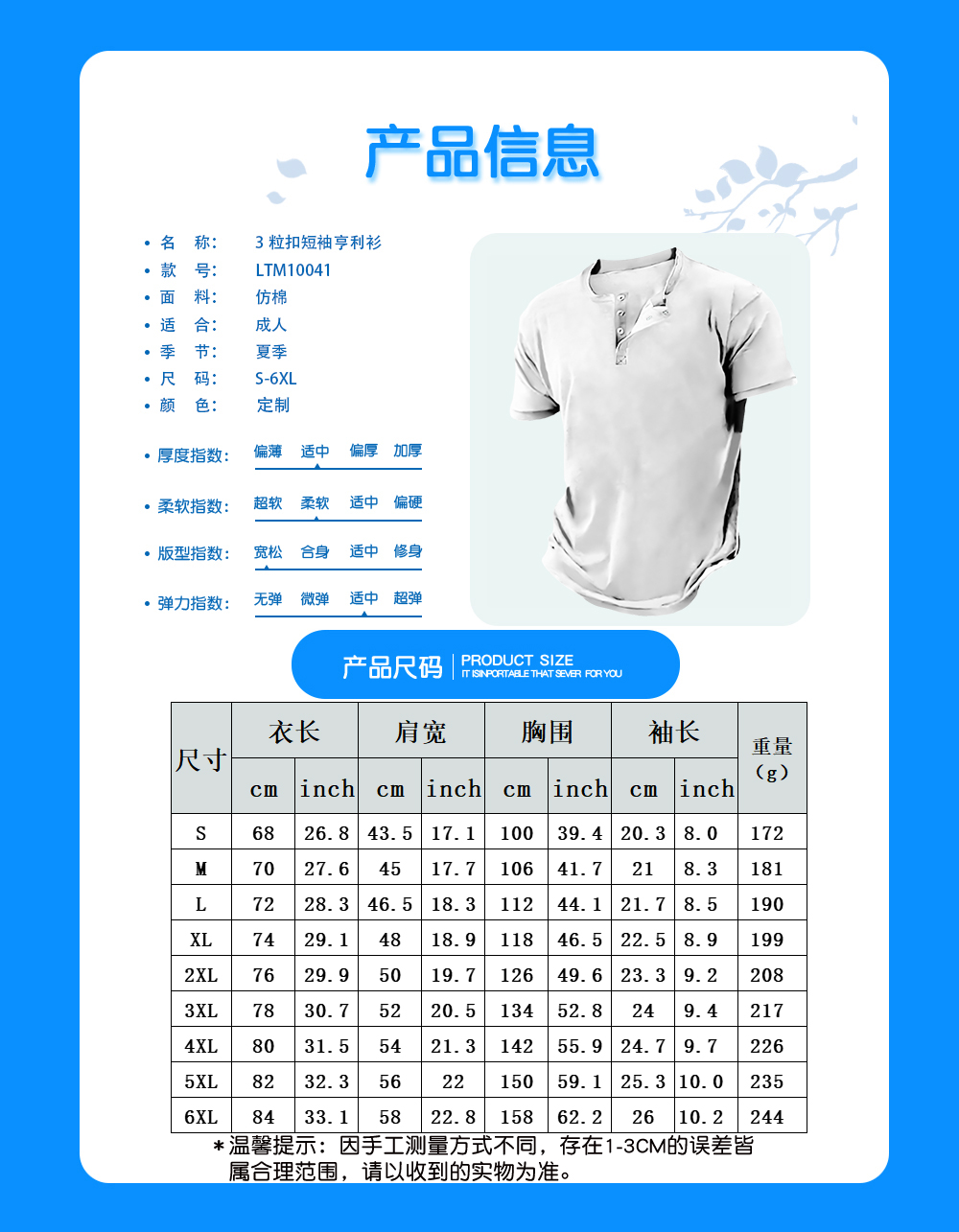 中文名称:3粒扣短袖亨利衫英文名称:产品货号:LTM10041生产工艺: 满印印花产品材质: 涤纶(Polyester)